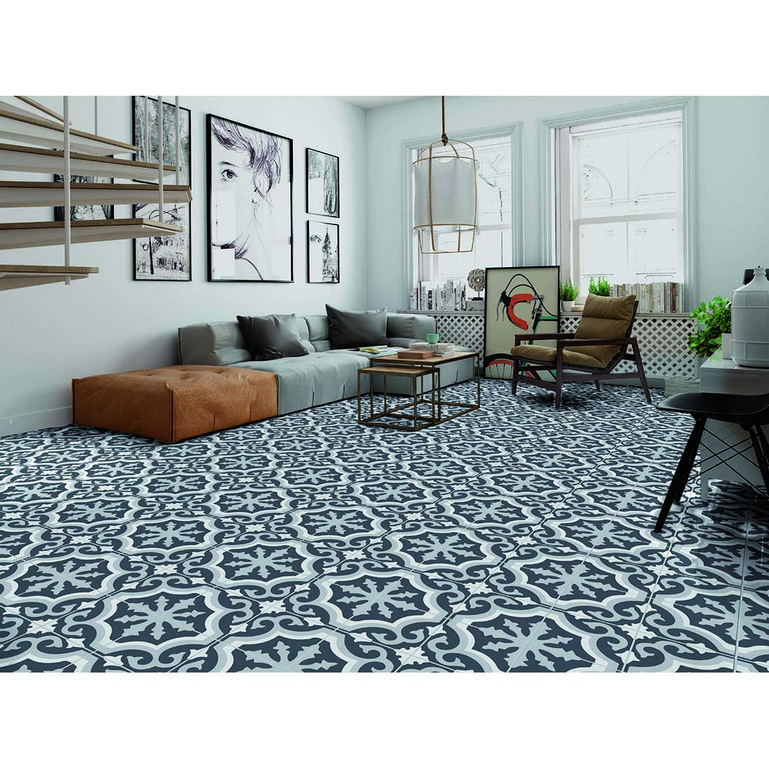 Lancaster Grey 450×450 (45x45cm) White, Black and Grey Pattern Porcelain floor tile in a classic victorian themed design which looks stunning on any floor area also walls. Suitable for external (Outside) use too, looking fabulous on door steps etc.